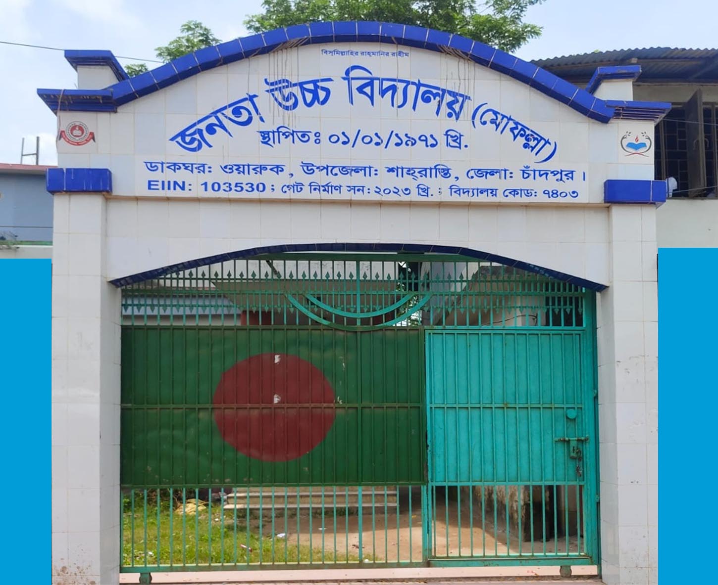বিদ্যালয় পরিচিতি “জনতা উচ্চ বিদ্যালয়ের ইতিকথা” শাহ্‌রাস্তি উপজেলাধীন টামটা(দ:) ইউনিয়নের ০১ নং ওয়ার্ড এ অবস্থিত অত্র বিদ্যালয়টি মোফল্লা, ধোপল্লা, সোনাচোঁ ও এনায়েতপুর (হাজীগঞ্জ উপজেলাধীন) গ্রামের কতিপয় সামাজিক শিক্ষানুরাগী ব্যাক্তিগণের একান্ত প্রচেষ্টায় ১৯৭১ খ্রিষ্টাব্দে ০১ জানুয়ারী জনতা উচ্চ বিদ্যালয়টি প্রতিষ্ঠা করেন। প্রতিষ্ঠাকালীন সময়ে বিদ্যায়টি নিম্ন মাধ্যমিক বিদ্যালয় হিসেবে প্রতিষ্ঠিত হলেও শিক্ষা বিতরনের অগ্রনী ভূমিকা পালন করায় read more